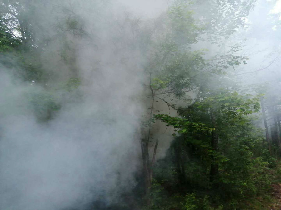 2019年6月1日,安圖林業有限公司島安松林中機器轟鳴、白煙滾滾,這是防治專業工作人員正在林間噴施煙霧藥劑除治松毛蟲。而這僅僅是森防員們的日常工作的縮影。